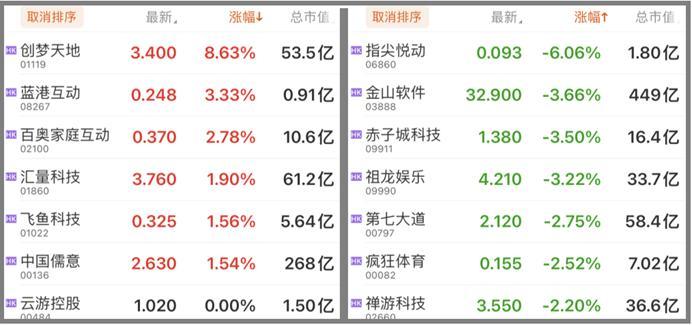 港股市场:收录的游戏概念股仅有不到两成股价上涨,其中创梦天地股价迎来了近3个月以来的单日最高涨幅,股价下滑的公司中仅指尖跃动跌幅超5%。