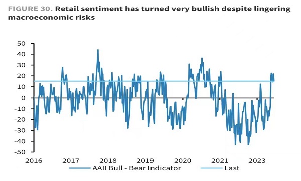 调查显示,受访者对股市的看涨情绪——即对未来六个月股市会上涨的预期——本月创下2021年以来的最高水平。多空差——即认为股市将走高的投资者与预期股市将下跌的投资者之间的数量差——已经连续六周为正。这是自2021年11月以来多空差保持正值最长的一段时期。