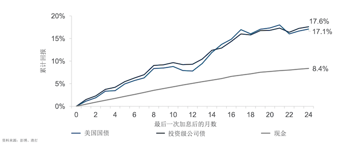 目前,发达市场的公债、高质量的信用债成为市场追捧的资产,一来票息位于高位;二来若降息周期开启,亦能斩获额外的资本利得。渣打中国财富管理部首席投资策略师王昕杰对记者表示,数据显示,在前三次加息周期中,投资级债券、美国国债在最后一次加息后的24个月总回报分别达到17.6%、17.1%,远超现金回报的8.4%。美国国债被认为是经济衰退期的对冲工具。