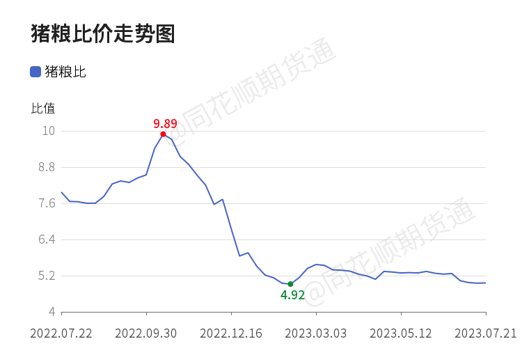 猪粮比价:全国7月21日当周已涨至4.96,周涨幅0.25%,月跌幅5.56%。