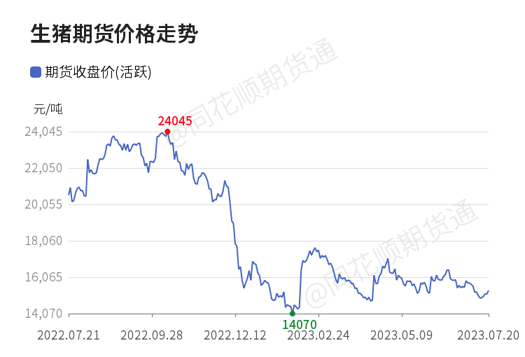 生猪主连7月20日已涨至15340.00元/吨,当日涨幅1.25%,周涨幅2.71%,月跌幅3.61%。