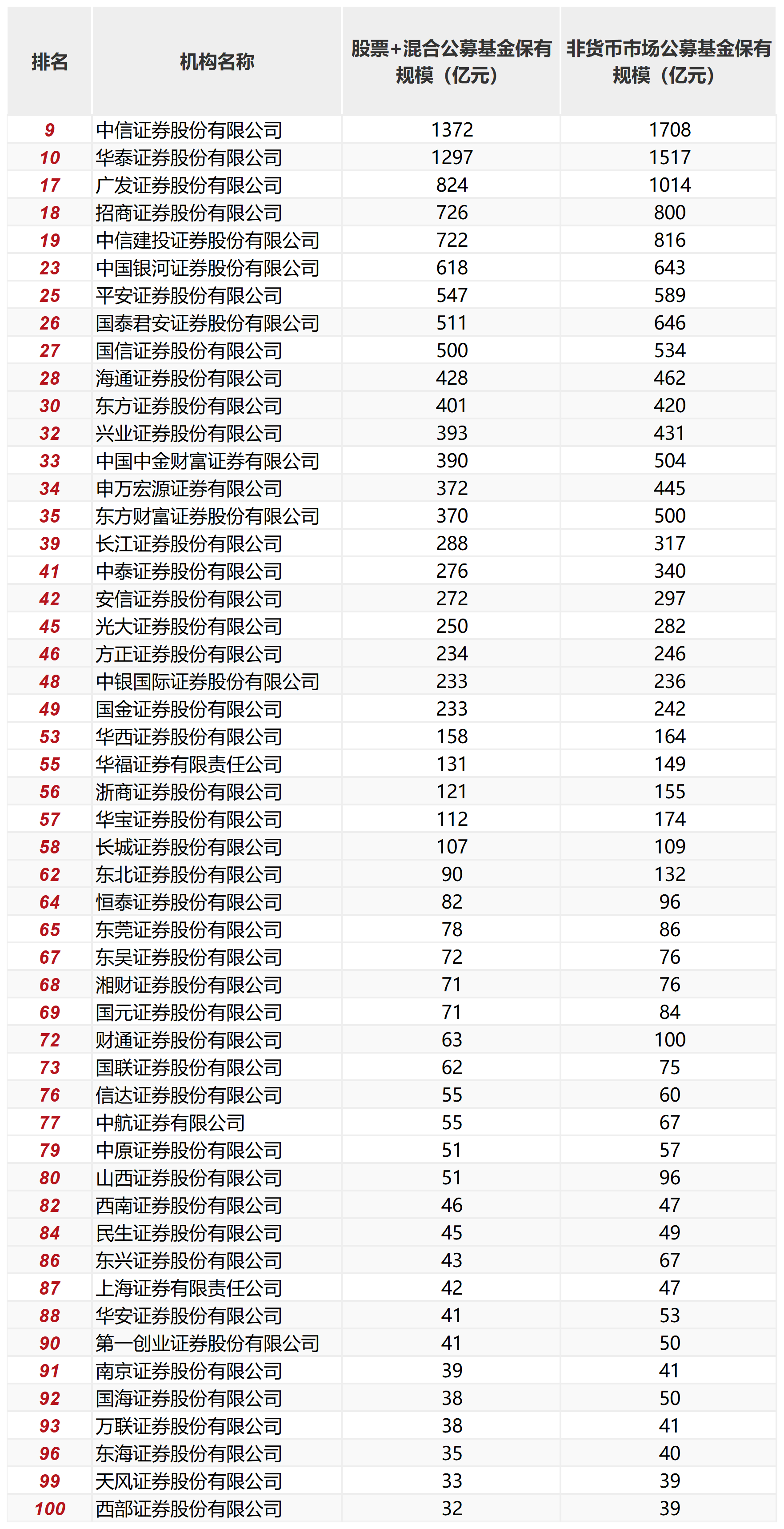 在进入基金代销百强榜单的51家券商中,头部竞争仍十分激烈。中信证券和华泰证券股混基金保有规模和非货币基金保有规模均超过千亿元,位列一二。值得一提的是,第二季度广发证券非货币基金保有规模也进入了千亿元行列。