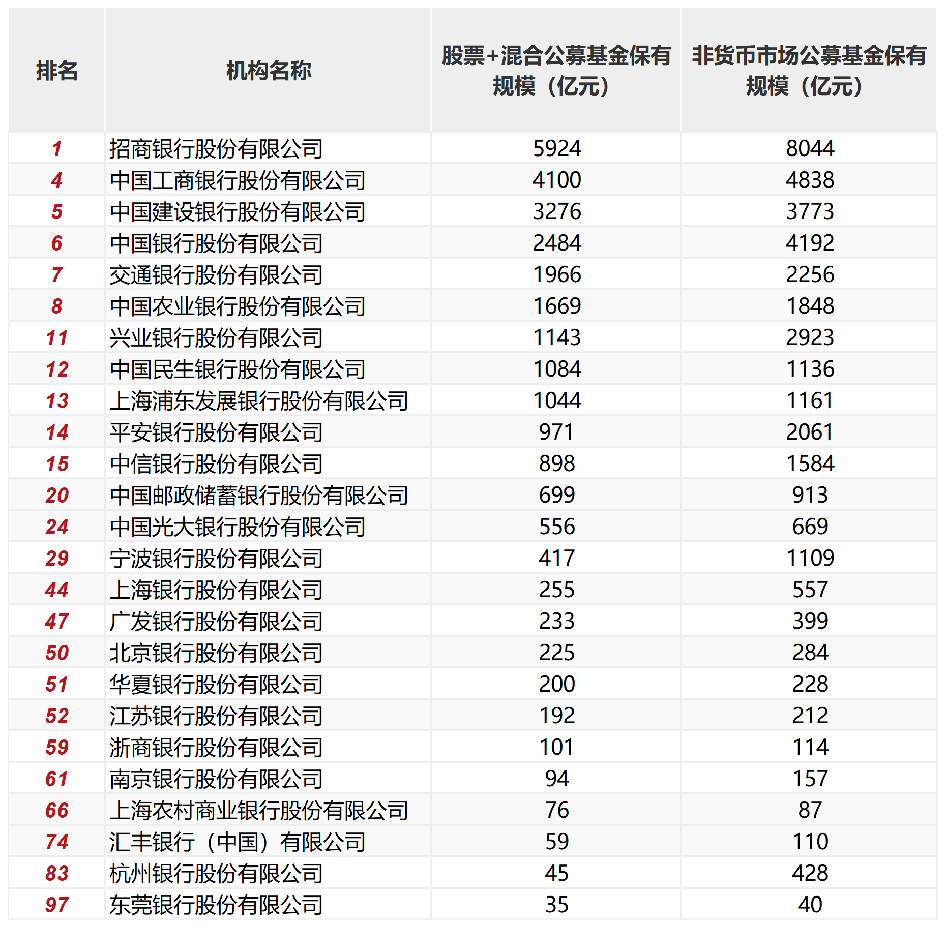 在进入百强榜单的25家银行中,招商银行等9家银行股混基金保有规模超过千亿元,较上季度减少1家;另有12家银行非货币基金保有规模均超过千亿元,与上季度持平。