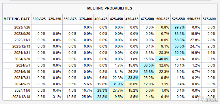 根据芝商所(CME)的FedWatch利率期货工具,美联储下周加息25基点的概率达到99.2%,随后利率保持不变,明年3月有40%的概率迎来降息。