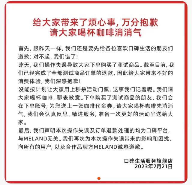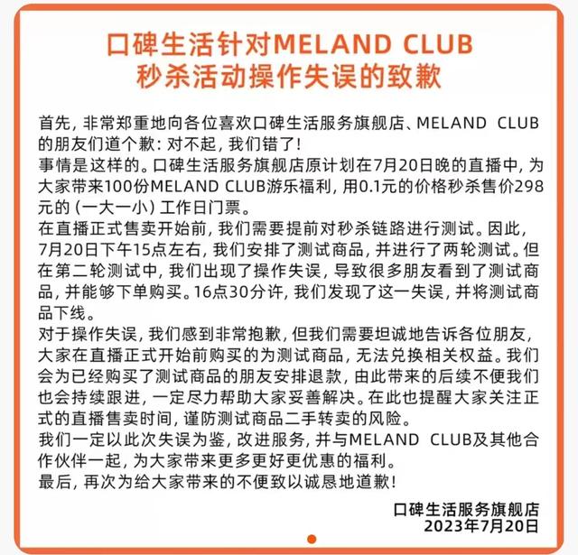 随后,“口碑生活”服务旗舰店在店铺首页贴出致歉信,声称原计划在7月20日晚的直播间设置100份MELAND CLUB游乐福利,用0.1元的价格秒杀售价298元的工作日门票(一大一小)。因为直播正式售卖前需要提前测试秒杀链路,因此20日下午3点左右安排了测试商品,并进行了两轮测试。