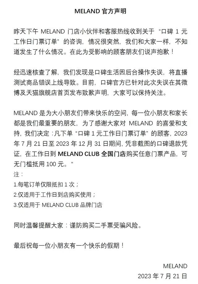 7月21日0点13分,MELAND通过官方微信公众号发布声明称20日下午MELAND门店和客服热线收到关于“口碑1元工作日门票订单”的咨询,情况很突然,“和大家一样,不知道发生了什么情况”。