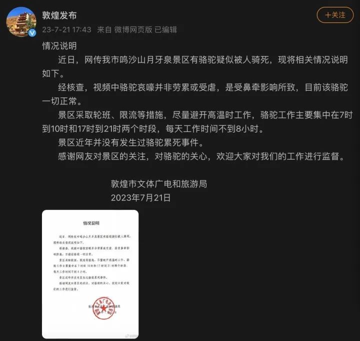 同日,敦煌文旅局发布情况说明称,网传视频中骆驼哀嚎并非劳累或受虐,是受鼻牵影响所致,目前该骆驼一切正常。景区采取轮班、限流等措施,尽量避开高温时工作,骆驼工作主要集中在7时到10时和17时到21时两个时段,每天工作时间不到8小时。景区近年并没有发生过骆驼累死事件。