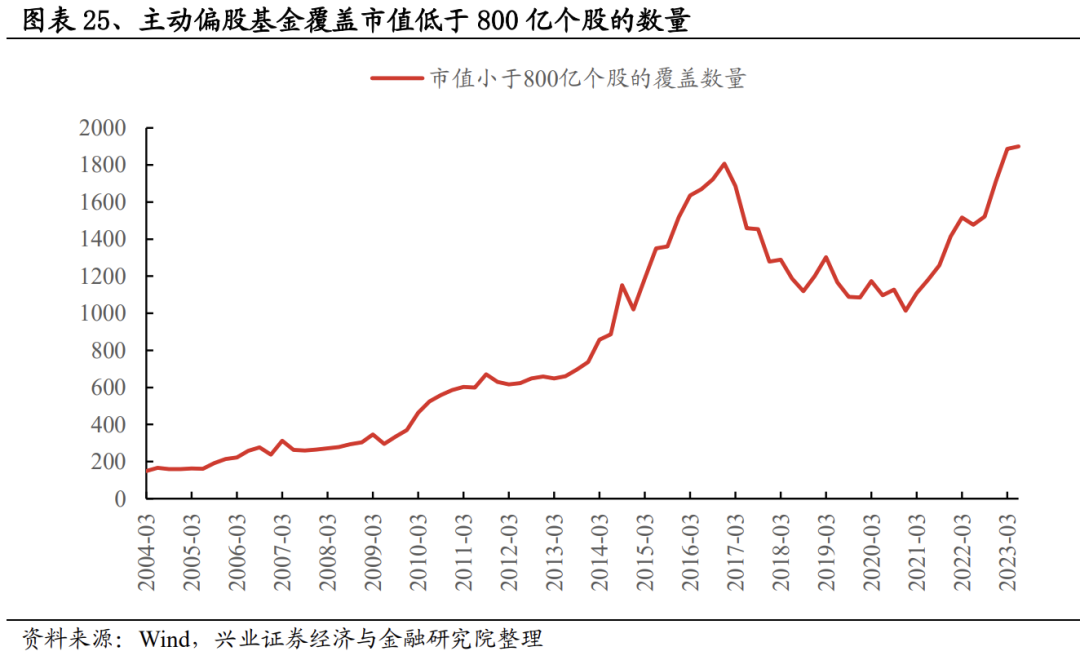 从基金覆盖数来看,基金对于中小市值个股的覆盖度继续上升。今年二季度,主动偏股型基金重仓股中,区间平均市值小于800亿个股的数量为1900只,较2023Q1上升10.09%,处于历史最高水平。
