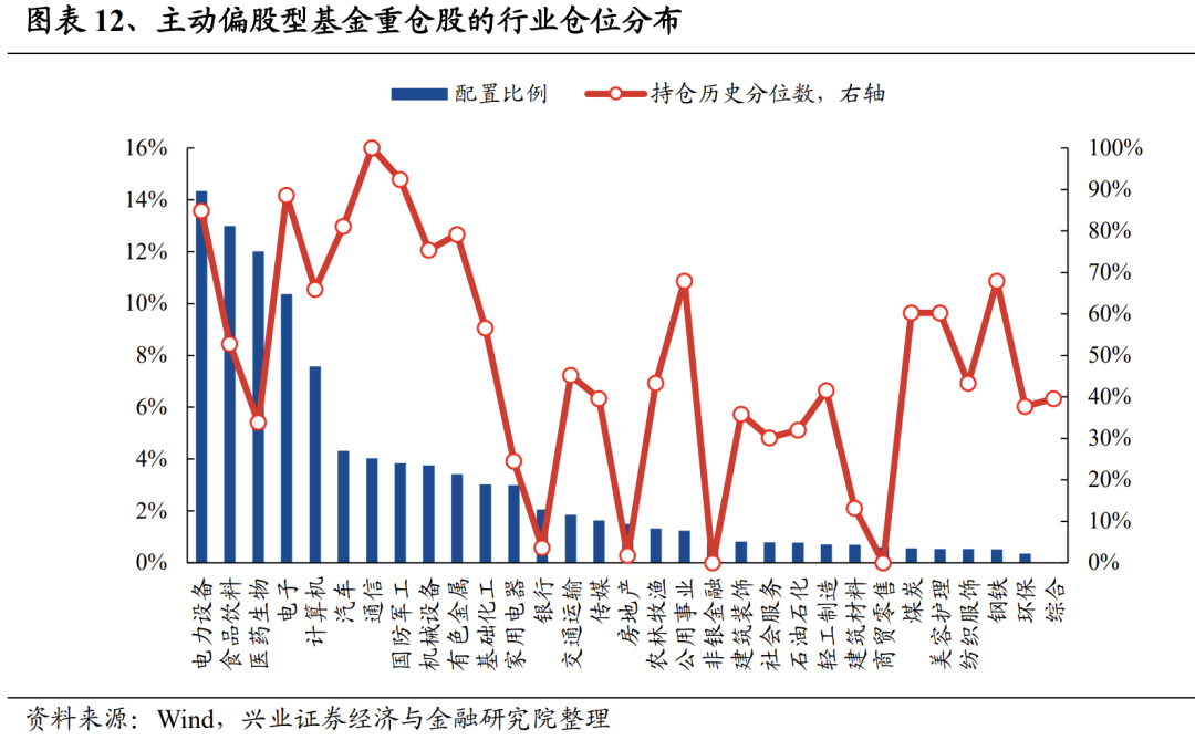 从一级行业绝对仓位来看,电力设备重回公募第一大重仓行业,前五大重仓行业较上一季度维持不变。主动偏股型基金仓位前五的行业分别是电力设备、食品饮料、医药生物、电子和计算机,配置比例分别为14.34%、13.0%、12.02%、10.36%、7.57%。仓位后五的行业分别是综合、环保、钢铁、纺织服饰和美容护理,配置比例分别为0.01%、0.36%、0.51%、0.53%、0.55%。从持仓历史分位数来看,通信、电子、汽车、电力设备和国防军工仓位处于历史较高的水平,而银行、非银金融和房地产的仓位处于历史极低水平,此外,食品饮料和医药生物的持仓分位数也处于中等和中等偏低的水平。