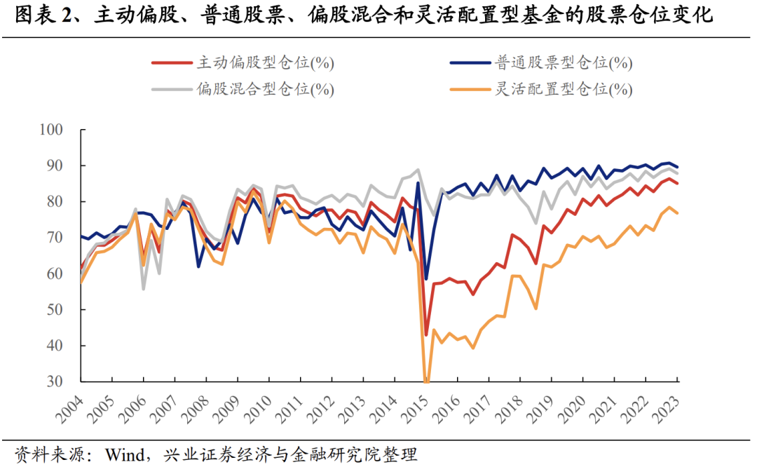 二季度主动偏股基金仓位回落1.31pct,但仍处于2004Q2以来第三高的水平。2023年二季度,上证指数、沪深300、创业板指分别下跌2.16%、5.15%、7.69%,导致主动偏股基金持股市值较3月底有所回落,2023Q2主动偏股型基金资产净值规模为4.55万亿、环比回落8.01%,持股市值为3.87万亿、缩水9.41%。股票仓位方面,截至2023Q2,与一季度末相比,主动偏股基金仓位由85.36%回落至85.05%,但仍处于2004Q2以来97.3%的较高分位数水平。其中,普通股票型由90.71%下滑1.10pct至89.61%,偏股混合型由89.12%下滑1.28pct至87.84%,灵活配置型由78.44%下滑1.60pct至76.84%。随着市场陷入震荡调整、行业轮动加速,公募基金相对偏谨慎,于二季度小幅降低了权益资产的仓位。