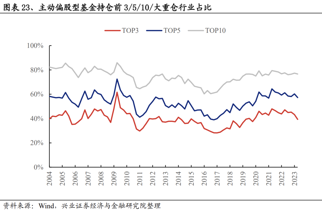 主动偏股型基金持仓集中度再度下行。行业视角下,主动偏股基金前3/5/10大重仓行业持仓占比较上一季度分别回落3.94pct、2.95pct、0.71pct。但个股视角下,主动偏股型基金持股市值前10/30/50/100的重仓股占全部重仓股持仓市值的比例较上一季度减少1.30pct、1.36pct、1.85pct和0.91pct。主动偏股基金持股集中度延续了下降。