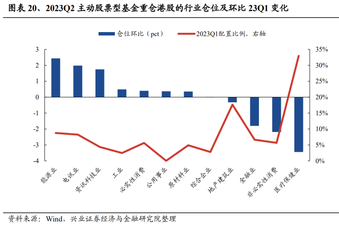 行业方面,公募持有港股能源、电讯和资讯科技行业的继续回升,医疗保健和非必需性消费仓位则显著回落。重仓股口径下,2023Q2主动偏股型基金加仓较多的行业是能源、电讯业和资讯科技行业,加仓比例分别为2.44pct、1.98pct、1.74pct。2023Q2主动偏股型基金减仓较多的行业是医疗保健、非必需性消费和金融行业,减仓比例分别为-3.44pct、-2.19pct、-1.80pct。