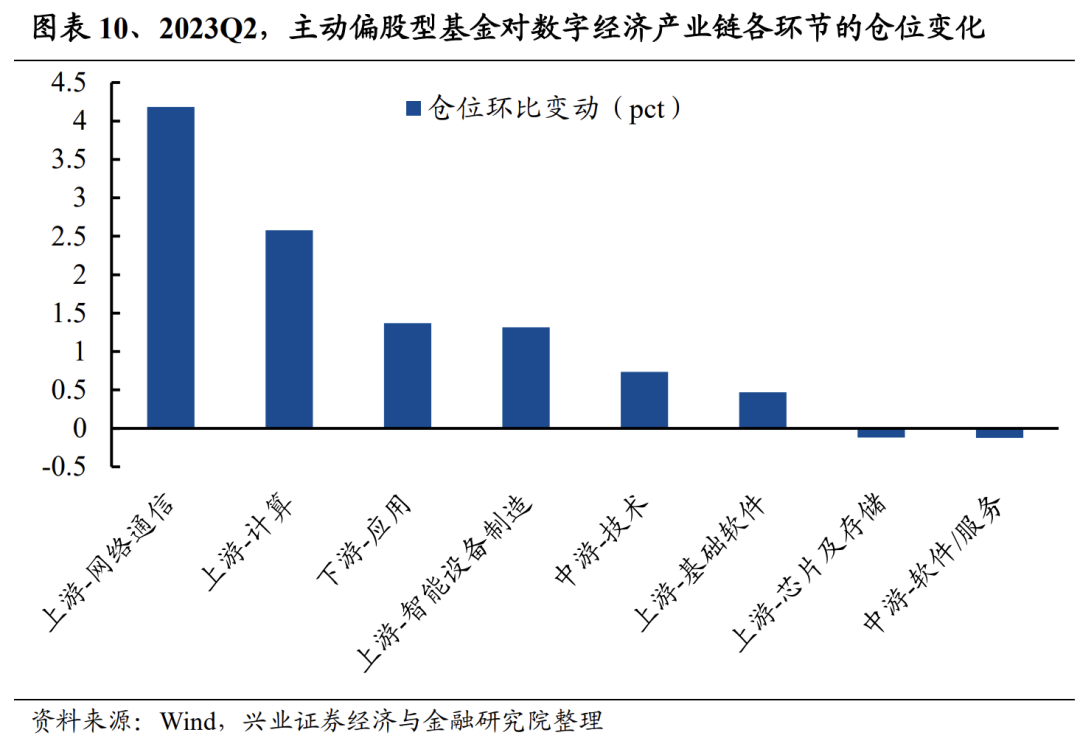 此外,根据兴证策略团队独家构建数字经济60大细分行业来看来看,数字经济内部也有所分化。2023Q2,公募以加仓数字经济板块的上游算力(基站、服务器、光模块、IDC等)为主、而上游的芯片及存储和中游的软件服务仓位小幅回落。