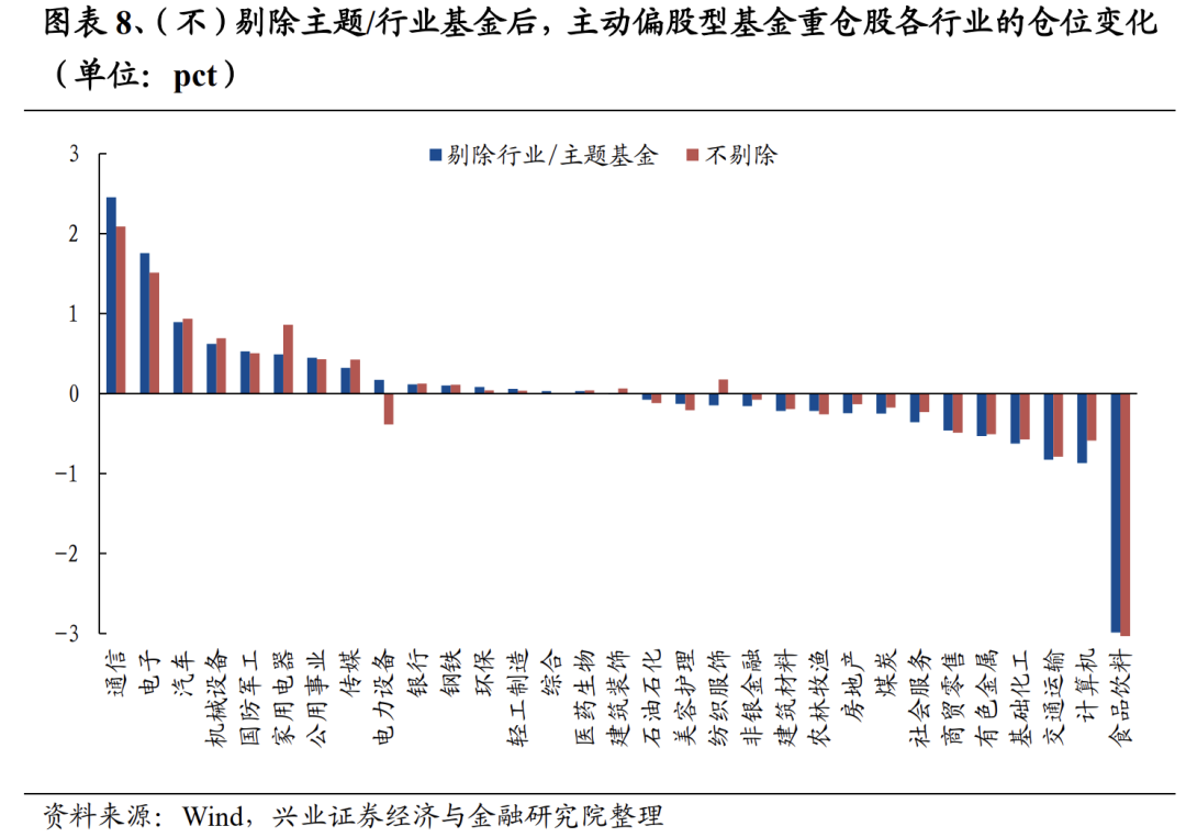 剔除主题/行业基金后,公募仍然以加仓通信、电子、汽车、机械和军工为主,食品饮料仓位下滑幅度依然显著。将新能源/医药/消费/TMT主题或行业基金剔除后,23Q2主动偏股型基金加仓较多的行业是通信、电子、汽车、机械和军工,加仓比例分别为2.45pct、1.76pct、0.89pct、0.61pct、0.53pct。2023Q2主动偏股型基金减仓较多的行业是食品饮料、计算机、交通运输、基础化工和有色金属,减仓比例分别为-2.98pct、-0.87pct、-0.83pct、-0.62pct、-0.53pct。对比全口径来看,剔除行业/主题基金后,公募对通信和电子的仓位提升更极致,汽车、机械、军工、交运等行业的仓位变动相差较小,但家电仓位提升幅度和食品饮料的减仓幅度收窄,计算机的减仓幅度更极致。