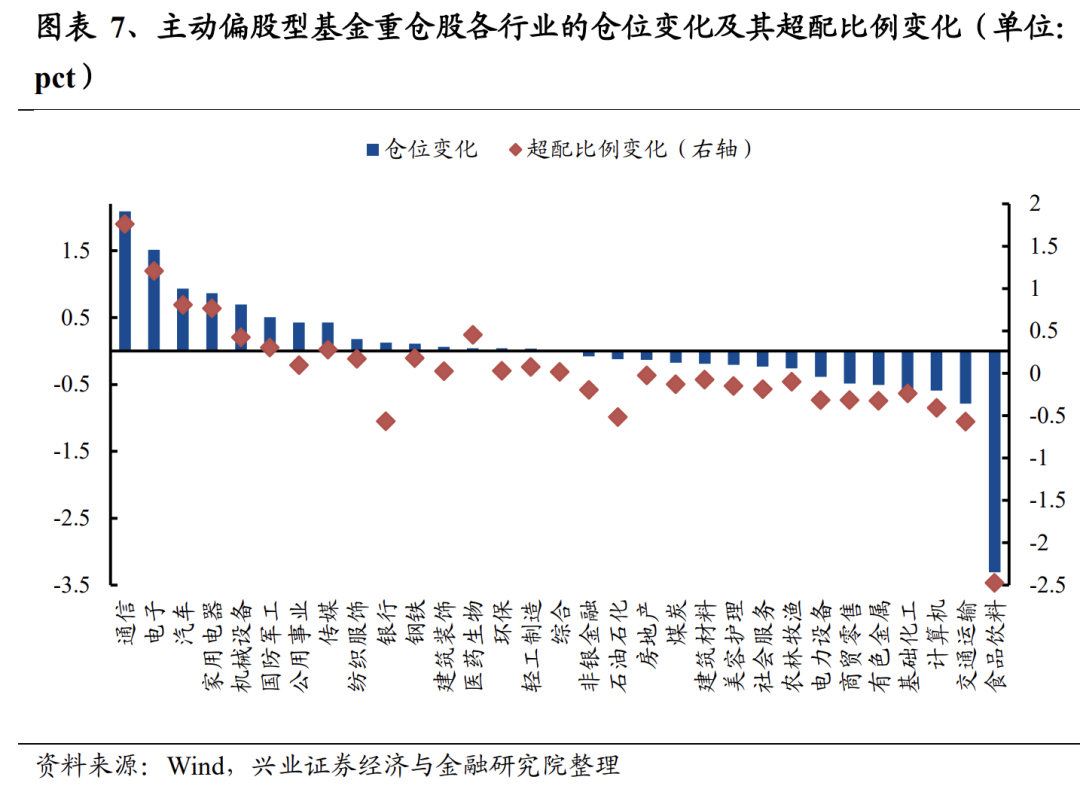从一级行业仓位变动来看,主动偏股型基金大幅加仓通信、电子和汽车。2023Q2主动偏股型基金加仓较多的行业是通信、电子、汽车、家用电器和机械设备,加仓比例分别为2.09pct、1.51pct、0.93pct、0.86pct、0.69pct。2023Q2主动偏股型基金减仓较多的行业是食品饮料、交通运输、计算机、基础化工和有色金属,减仓比例分别为-3.31pct、-0.79pct、-0.59pct、-0.57pct、-0.51pct。