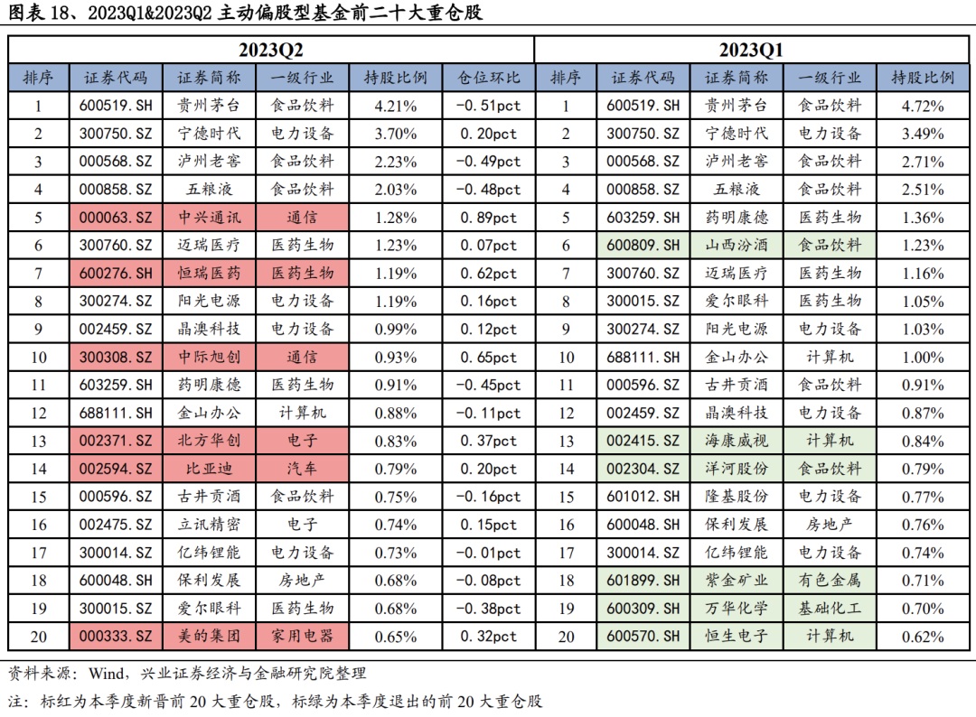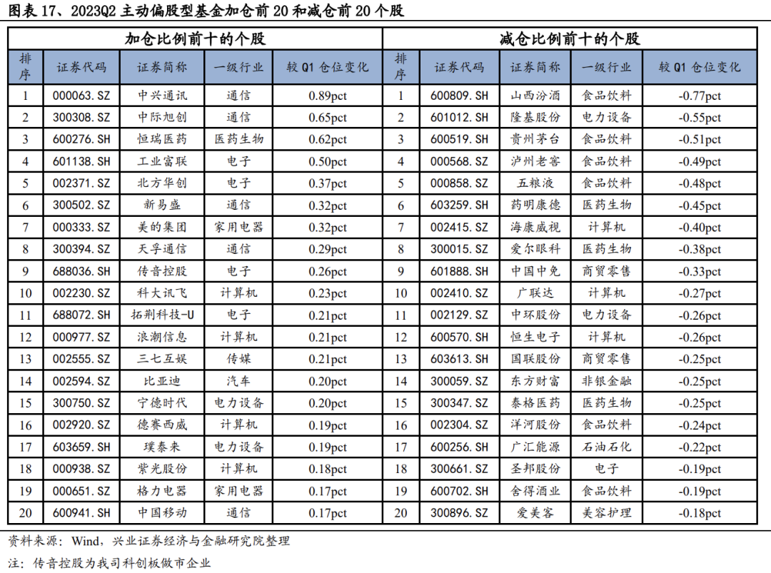 2023年二季度,主动偏股型基金加仓比例前5的个股分别是中兴通讯、中际旭创、恒瑞医药、工业富联和北方华创,持股比例较上一季度分别增加0.89pct、0.65pct、0.62pct、0.50pct和0.37pct;减仓比例居前5的个股为山西汾酒、隆基股份、贵州茅台、泸州老窖和五粮液,持股比例较上一季度分别减少0.77pct、0.55pct、0.51pct、0.49pct、0.48pct。