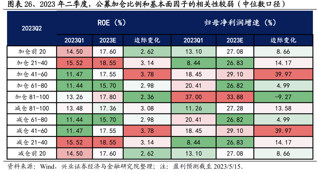 与2023Q1相同,2023Q2公募加仓比例和基本面因子的相关性依然较低。尽管4月以来,企业年报、一季报和各项经济数据相继披露,但公募加仓比例和财务指标的相关性依然处于低位,无论是从ROE和业绩增速的绝对水平还是环比变化来看,其和加仓比例均没有出现较为明显的线性关系。