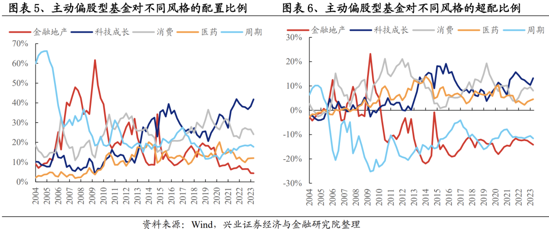风格层面,主动偏股型基金继续增持科技成长(以TMT为主),大幅减仓消费。2023Q2,主动偏股型基金对科技成长、消费、周期、医药和金融地产的配置比例分别41.78%、24.08%、17.73%、12.02%和4.38%,较上一个季度的变化分别为3.55pct、-2.52pct、-0.99pct、0.04pct和-0.09pct。此外,主动偏股型基金对科技成长、消费、周期、医药和金融地产的超配比例分别为13.20%、8.08%、-11.55%、4.54%和-14.14%,较上一个季度的变化分别为2.82pct、-1.48pct、-1.02pct、0.45pct和-0.79pct。