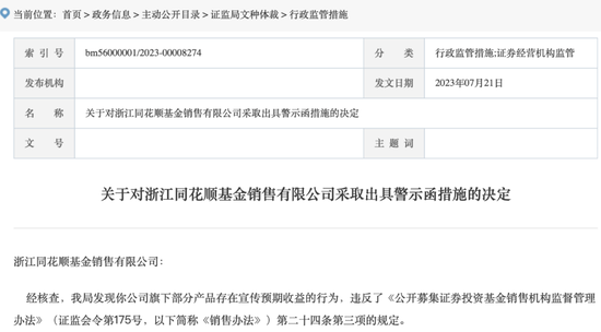 7月21日,浙江证监局公告显示,因旗下部分产品存在宣传预期收益的行为,浙江同花顺基金销售有限公司(简称“同花顺基金销售”)被采取出具警示函措施的决定,并记入证券期货市场诚信档案。