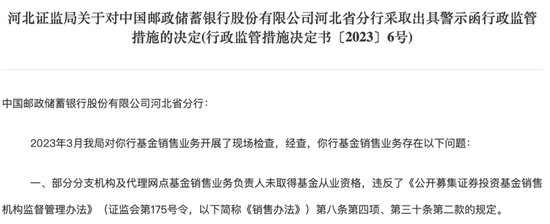 因此,河北证监局决定对中国邮储银行采取出具警示函的行政监管措施,要求该行高度重视,切实加强对分支机构合规管控和人员资质管理,并于4月30日前提交书面整改报告。