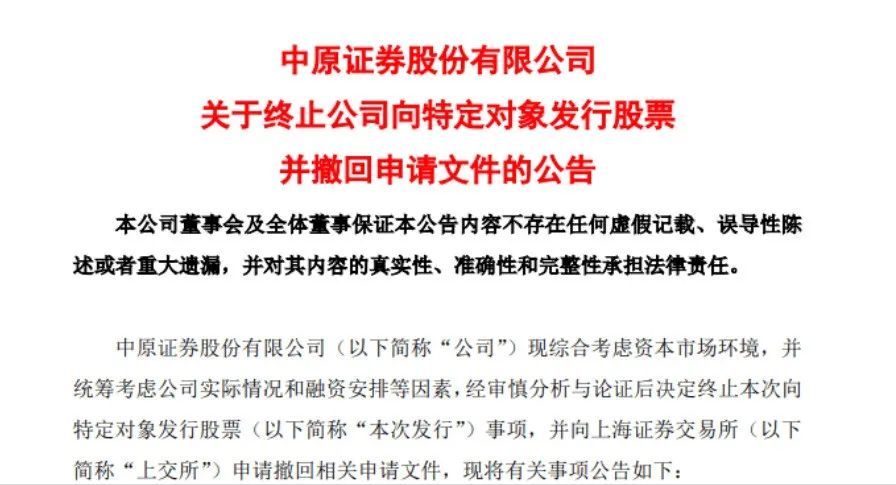 7月21日,中原证券公告,现综合考虑资本市场环境,并统筹考虑实际情况和融资安排等因素,经审慎分析与论证后决定终止本次向特定对象发行股票事项,并向上交所申请撤回相关申请文件。