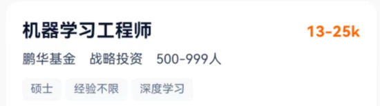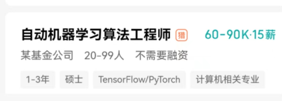 另一家大型基金公司也在招聘机器学习/深度学习,开出25-50K·23薪的有竞争力的薪资。还有基金公司给出60-90K·15薪的更高筹码。