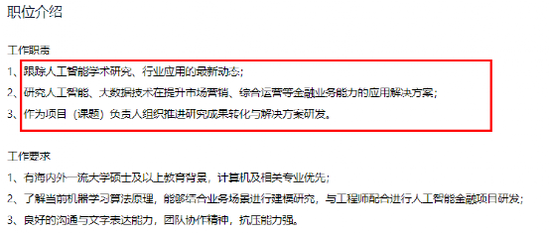 也有公司在实名招聘.。如创金合信基金就在寻找机器学习开发工程师。在工作职责方面,在该岗位任职需要负责机器学习、NLP、OCR、RPA等人工智能技术及算法的研究和应用开发,结合基金业务实际应用场景形成具有竞争力的智能化应用解决方案,并实施落地;跟踪人工智能最新研究成果和技术趋势,适时引入相关技术驱动业务创新。同时,鹏华基金也在招兵买马,实名招聘机器学习工程师。