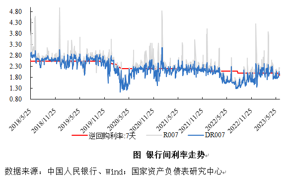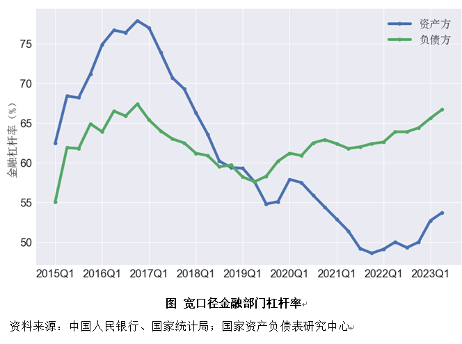 2023年二季度,资产方口径下的金融杠杆率从一季度末的52.7%升至53.7%,上升了1.0个百分点;负债方口径下的金融杠杆率从一季度末的65.6%升至66.7%,上升了1.1个百分点。上半年资产方口径的金融杠杆率共上升了3.7个百分点,负债方口径的金融杠杆率共上升了2.3个百分点。银行间同业拆借和银行为非银行金融机构的净借出占比与一季度基本持平,金融杠杆率的上升也主要归因于经济增速的放缓。