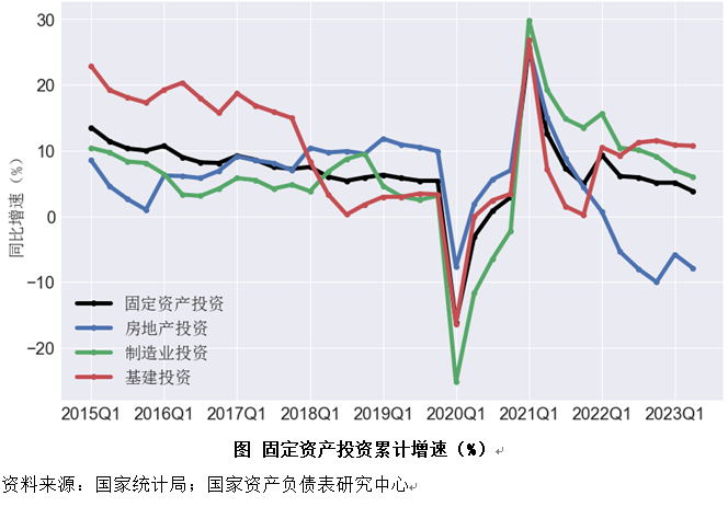 二季度的企业投资增速继续下行。固定资产投资同比增长了3.8%,低于一季度同比增速,更是远低于二季度名义GDP的同比增速。在所有投资中,仍然是基建投资增速最快,二季度同比增长了10.7%,与一季度基本持平。而房地产投资的增速是最低的,同比下降了7.9%;制造业投资同比增长了6.0%,比一季度稍有下降。近年来,固定资产投资下降的主要原因就是房地产投资下降。而房地产投资的下降同时受到长期趋势因素和短期周期因素的影响。从长期趋势来看,人口负增长以及快速城镇化阶段接近尾声,地产投资的速度未来会呈现趋势性下滑的态势。但近两年来房地产投资增速都为负数,并不完全是趋势性因素。2022年末我国人口城镇化率为65.22%,虽已是较高水平,但户籍城镇化还有更大空间。近两年来房地产投资由正转负的更大原因在于经济周期性的下行,而房地产投资受经济周期的影响最为显著。