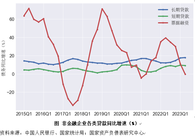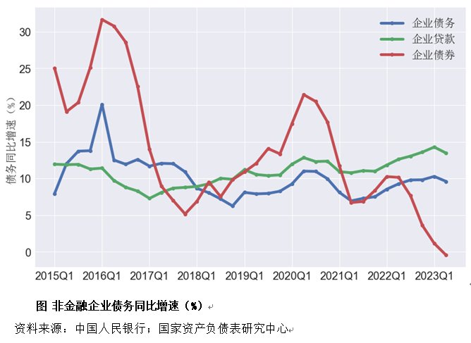 虽然流动性非常宽松,但企业部门债务增速仍有所下降。2023年二季度,企业部门的债务同比增长了9.6%,相比一季度的增速有所下降。其中企业贷款同比上升了13.5%,相对较高;而企业债券融资规模同比下降了0.4%。在经济增长下行压力较大,且之前几年企业债券出现较多违约的环境下,民营企业债券发行非常困难。对地方政府隐性债务的持续监管以及部分地区城投平台出现的技术性或摩擦性违约事件,也使得金融机构对城投债的投资更为谨慎,一些地区的新增城投债发行也出现困难。这些因素都导致企业债券融资的同比增长转为负数。而银行贷款则受银行流动性宽松的影响较大,在过去两年中基本保持增速上升的态势。企业部门的贷款融资和债券融资走势出现分化,企业的新增融资更多以贷款形式完成。