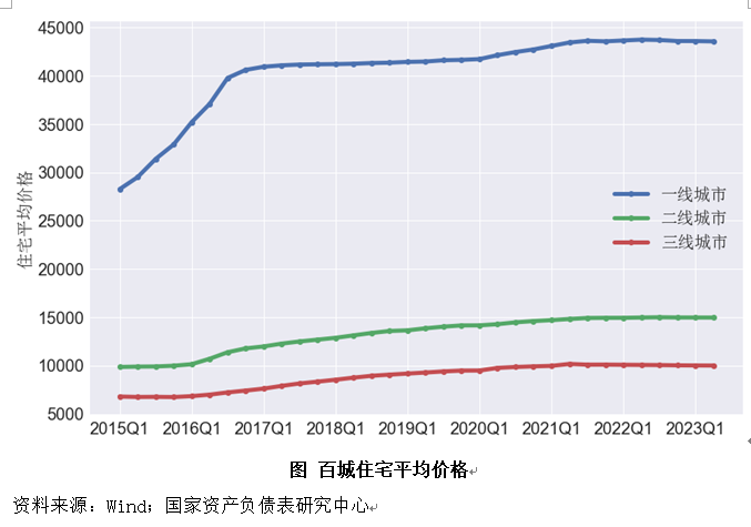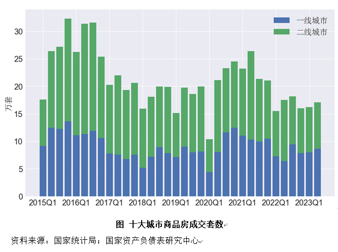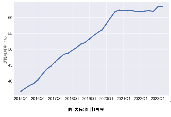 2023年二季度居民部门杠杆率上升了0.2个百分点,从2022年末的63.3%上升至63.5%;上半年居民杠杆率共上升了1.6个百分点。自2020年三季度开始,居民部门杠杆率始终在62%的水平上下波动,直到今年一季度,居民杠杆率再次有了一定的涨幅,但二季度又趋于平稳。房地产交易量下降是居民债务增速较低的直接原因。一季度的地产交易出现了短暂的复苏,但二季度再度掉头向下。居民部门住房投资意愿不足,降低了通过房贷加杠杆的行为。居民消费和投资的有效需求都下降,储蓄率相应较高,在短期内有利于改善居民资产负债表。但有效需求不足带来的经济增速下滑进一步导致房价下跌,也会反过来损害居民资产负债表。