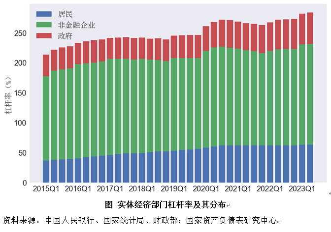 上一年(2022年)我国宏观杠杆率走势整体体现出“前高后稳”的态势,大部分涨幅都是在上半年完成的。我们判断这一特征也将是2023年的主要特征。在一季度报告中,我们预计二季度的宏观杠杆率将上升2~3个百分点,实际上升了2.1个百分点,基本符合预期。上半年宏观杠杆率共上升了10.8个百分点。我们在一季度报告中曾预计下半年宏观杠杆率会有所下降,但基于经济增长不达预期,尤其是一般物价水平(GDP缩减指数)已经由正转负,我们预计下半年宏观杠杆率仍将继续上升,全年上升幅度超过11个百分点。预计三季度将继续上升2~2.5个百分点,四季度杠杆率将有所下降,回落2个百分点左右。