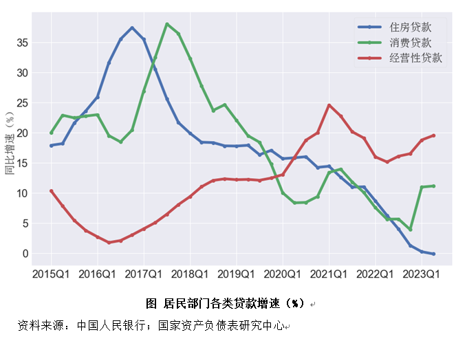 今年一季度居民住房贷款同比增速下降到0.3%,根据我们的估算,二季度居民住房贷款增速已由正转负,下降到-0.1%。住房贷款增速下降导致居民部门的杠杆率基本平稳。我们估算的二季度居民消费性贷款(除住房外)的增速提高到11.1%,经营性贷款增速提高到19.5%。经营性贷款是近年来居民加杠杆的主要方式,经营性贷款在居民全部贷款中的占比已经由2019年末的20.5%上升至当前的27%。