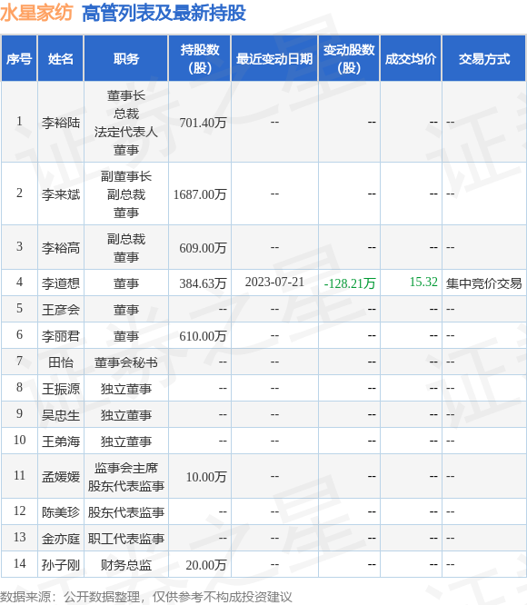 水星家纺近半年内的董监高及核心技术人员增减持详情如下: