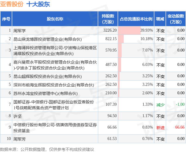 根据亚香股份2023年一季报公布的十大股东详情如下:
