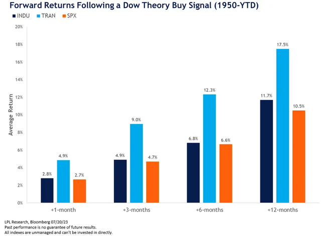 根据特恩奎斯特的数据,在道氏理论买入信号闪现后,标普500指数的12个月平均回报率为10.5%,随后六个月的平均涨幅为6.6%。
