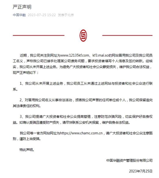 同时,中国华融还公布了唯一官方网站网址,请投资者和社会公众注意甄别,谨防上当受骗。