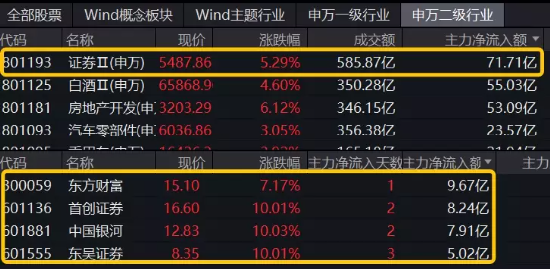 主力资金方面也有所表现,以申万二级行业口径,今日证券II获主力资金增仓71.71亿元,高居124个申万一级行业第1位,其中东方财富获近10亿元增仓,首创证券、中国银河、东吴证券也获主力资金净买入超5亿元。