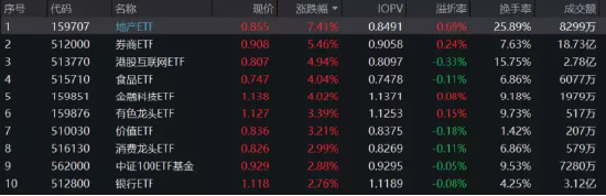 盘面上,以龙头房企为代表的地产和以证券为代表的金融板块集体爆发!地产方面,龙头个股掀涨停潮,地产ETF(159707)场内价格收盘上涨7.41%,领涨两市!“有行情,看券商”,券商ETF(512000)场内价格收涨5.46%,一举收复所有均线,交投激增超420%。