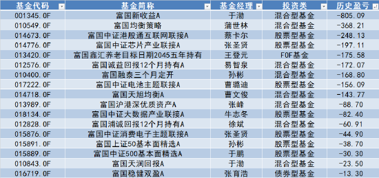 产生较大浮亏的几只产品有:富国新收益A、富国均衡策略以及富国中证港股通互联网联接A。这几只产品均带来200万以上浮亏,其中富国中证港股通互联网联接A为股票型基金,其余均为混合型基金。
