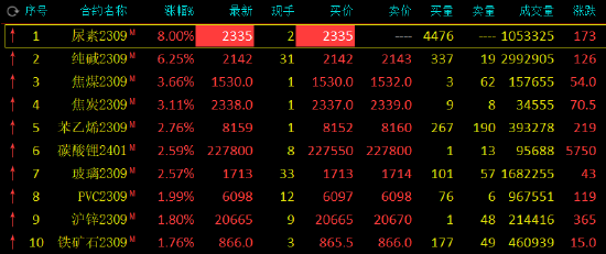 7月26日午盘收盘,国内期货主力合约大面积飘红,尿素涨停,涨幅8%,纯碱涨超6%,焦煤、焦炭涨超3%,玻璃、苯乙烯(EB)、碳酸锂涨超2%,聚氯乙烯(PVC)、沪锌、铁矿、棕榈、液化石油气(LPG)涨近2%。跌幅方面,鸡蛋跌近1%。