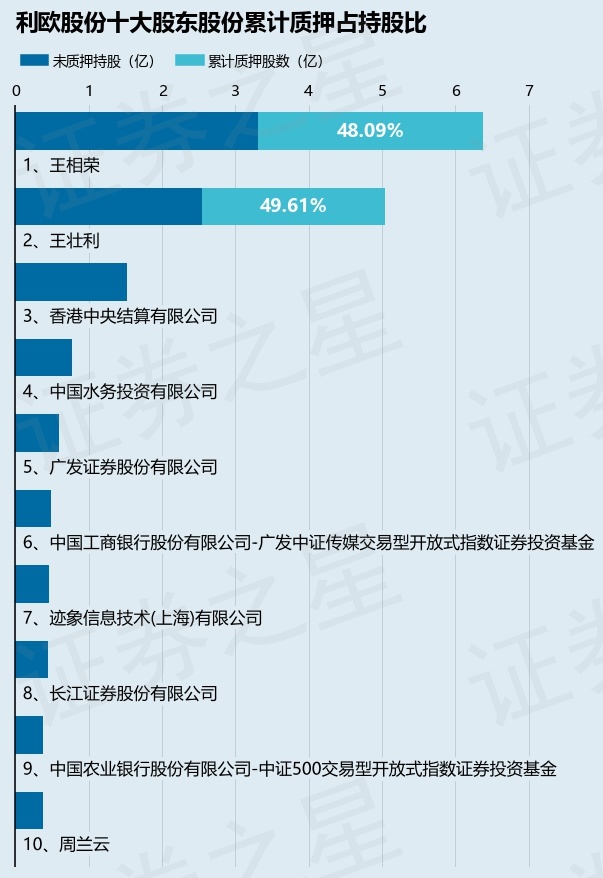 截止本公告日,股东王相荣已累计质押股份3.06亿股,占其持股总数的48.09%,股东王壮利已累计质押股份2.5亿股,占其持股总数的49.61%。本次质押后利欧股份十大股东的累计质押股份占持股比例见下图: