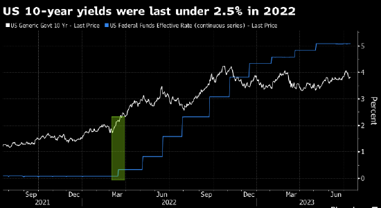 因有迹象显示美联储的加息行动可能即将结束,基准10年期美债收益率已从去年10月的高点下跌了近50个基点至3.84%左右。如果收益率下跌150个基点,将降至2.34%左右,为2022年初以来的最低水平。