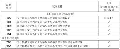 议案1采取累积投票制,对相关选举事项分别进行表决,股东所拥有的选举票数为其所持有表决权的股份数量乘以应选人数,股东可以将所拥有的选举票数以应选人数为限在候选人中任意分配(可以投出零票),但总数不得超过其拥有的选举票数。