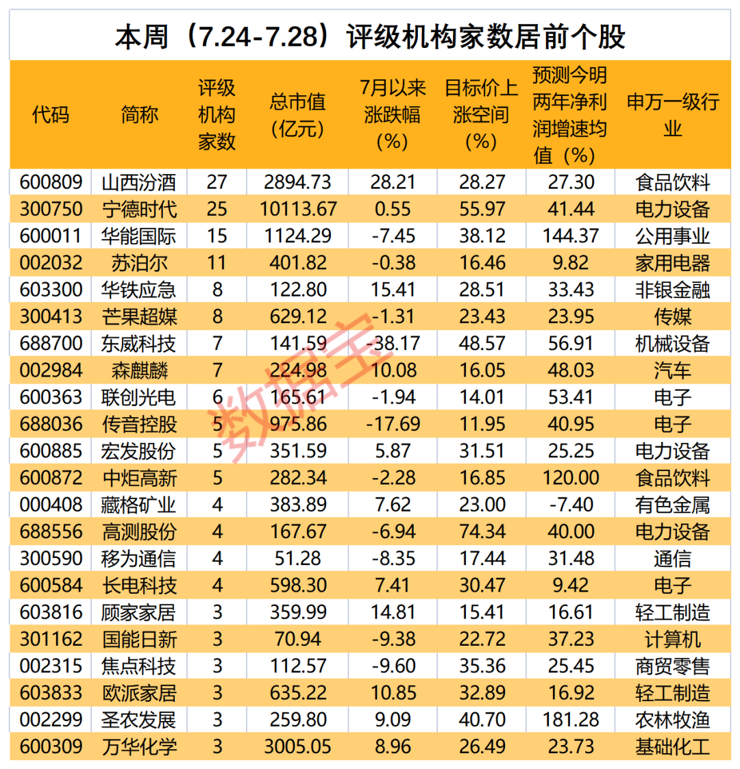 个股方面,22股获3家及以上机构给予“买入型”评级。清香白酒龙头山西汾酒最受关注,27家机构参与评级;宁德时代以25家机构评级,位居第二;华能国际、苏泊尔评级机构数量也居前。