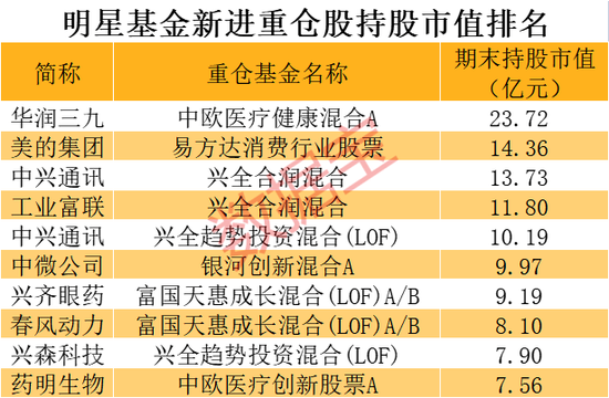 数据宝统计,从期末持股市值角度来看,有57股对应明星基金期末持股市值超过10亿元。