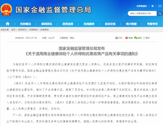 7月6日,国家金融监督管理总局印发《关于适用商业健康保险个人所得税优惠政策产品有关事项的通知》,于8月1日起实施。