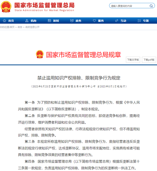 市场监管总局修订出台了《禁止滥用知识产权排除、限制竞争行为规定》,于8月1日起正式施行。
