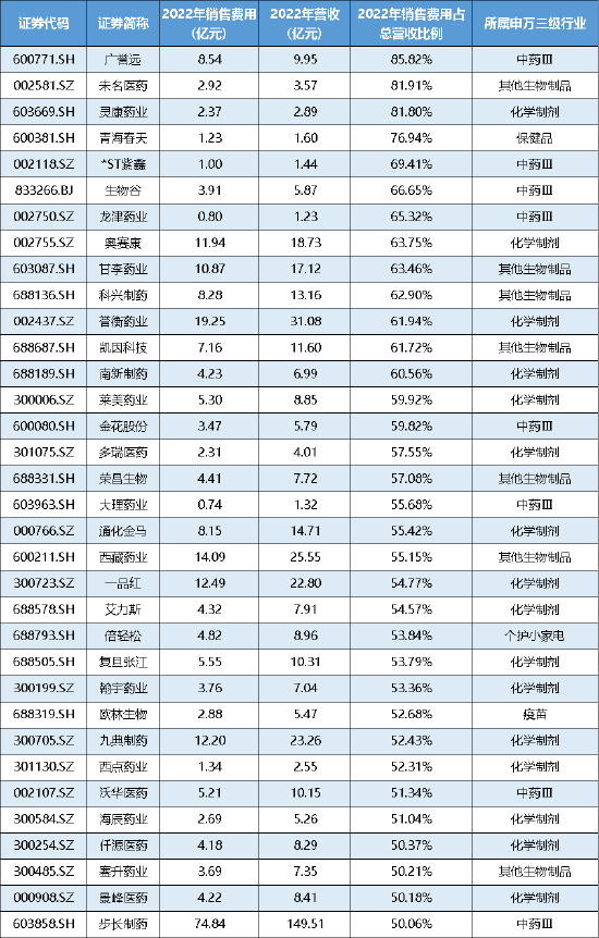 时至今日,据wind数据显示,剔除在科创板上市,尚未取得盈利的标的后,国内上市药企中,仍有诸多公司的销售费用率超过50%,这其中是否存在商业贿赂、利益输送等相关情况值得关注。以下为2022年销售费用率超过50%的药企名单: