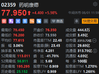 生物技术股上涨,药明康德港股高开后回落至77.95港元,截至午间上涨5.89%。公司昨晚公布业绩显示:2023年上半年实现收入188.71亿元,同比增长6.28%;归母净利润53.13亿元,同比增长14.61%;扣非后归母净利润47.61亿元,同比增长23.67%。单二季度实现收入99.08亿元,同比增长6.74%;归母净利润31.45亿元,同比增长5.09%;扣非后归母净利润28.92亿元,同比增长35.42%。